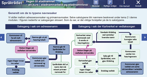 Det er litt ulik saksgang etter kva type namn det er snakk om. Kommunen vedtek adressenamn, medan Kartverket vedtek mellom anna gardsnamn, bruksnamn og naturnamn. I saker som gjeld slike namn, skal kommunen kunngjera at namnesaka er reist, samle inn høyringssvara som kjem inn og sende dei til Språkrådet for å få tilråding om skrivemåte. Når Kartverket har gjort vedtak om eit namn, gjer kommunen vedtak om avleidde adressenamn.