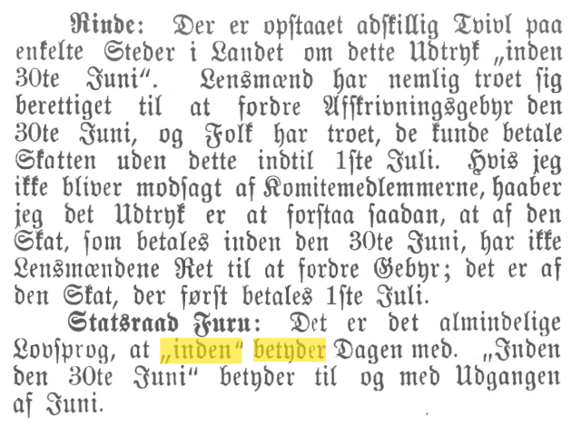Det er særlig frister satt til den første i måneden (eller uka) som skaper tvil. Det er ikke rart om innen 1. juni brukes eller tolkes som ‘før utgangen av mai’, altså ‘før juni’. Det er kanskje større enighet om at dagen er medregnet i innen 30. juni.