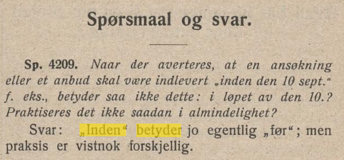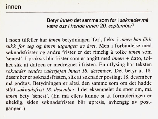 Hva ligger i ordet «innen»? Omfatter «innen torsdag» også torsdag, eller går grensa natt til torsdag klokka 00.00? Og hva med uttrykket «innen 1. juni»? Er 1. juni inkludert?
