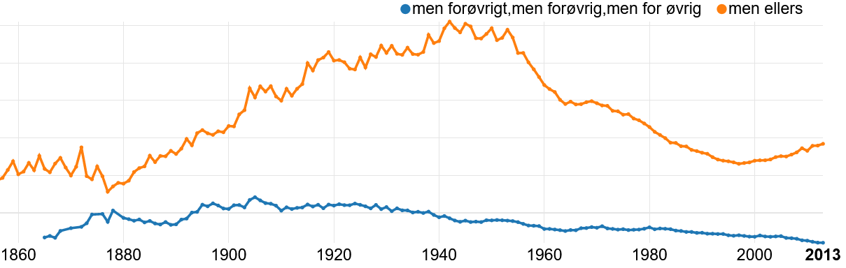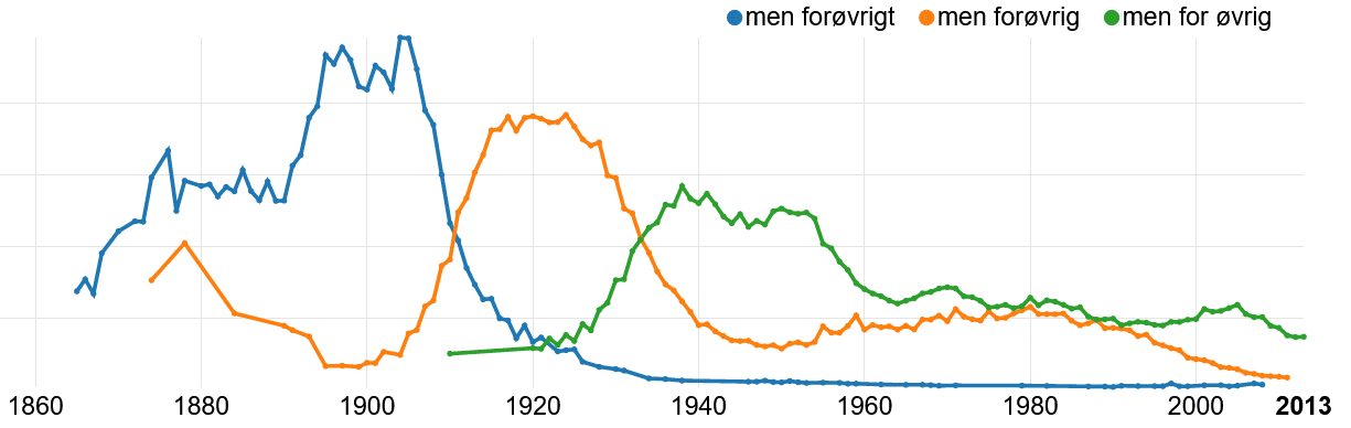 Nedenfor er resultatet av to boksøk (ved hjelp av n-gramtjenesten ved nb.no). Selve tallene har liten informasjonsverdi, så de har vi ikke tatt med; det er forholdet mellom grafene som er interessant. På den siste figuren ser vi også utviklingen for det mindre formelle nærsynonymet ellers (nynorsk elles) som i motsetning til for øvrig hele tiden har vært vanlig i norsk talemål. For øvrig er lite brukt i nynorsk.