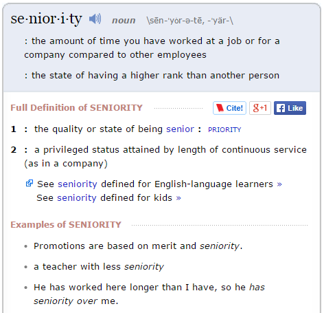 Slår ein opp i engelske ordbøker, ser ein at seniority har fleire tydingar. Her er eit utklipp frå ordboka Merriam-Webster:
