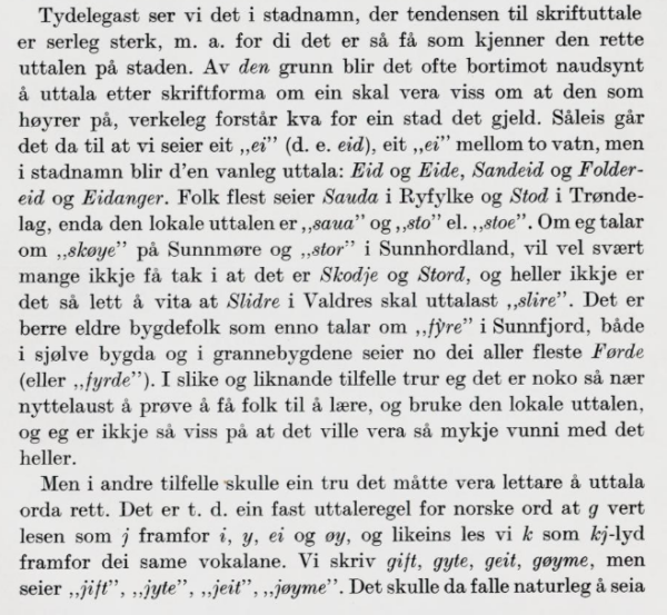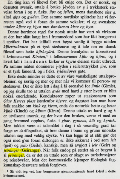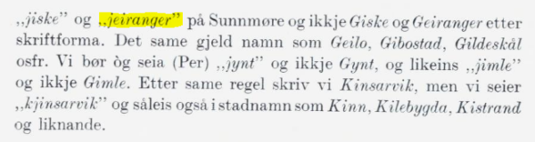 Alle uttaler fremdeles Geilo /jeilo/ i samsvar med tradisjonen og vanlige uttaleregler, men det har blitt så vanlig å uttale Geiranger med hard g- at NRK har endret uttalerådet sitt fra /jeiranger/ til /geiranger/. Den gamle lokale varianten hadde j-lyd: /jårånjen/. Den hadde trykk på første stavelse og tonem 2 i /jårang-/. (Trykk på -ang- skal også ha forekommet.)