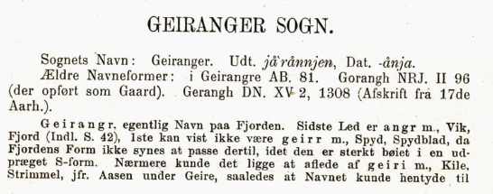 Den tidligere anbefalte uttalen /jeiranger/ har den samme tonegangen som /jårången/, i likhet med de fleste anger-navn, som Orkanger og Flatanger. Skriftuttalevarianten /geiranger/ hører man ofte med tonem 1 i /geirang-/ og av og til med trykk på /-ang-/ (som i Hardanger og Stavanger), men heller ikke NRK anbefaler disse uttalevariantene.