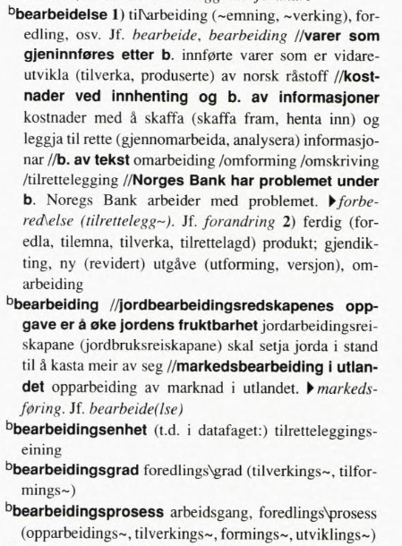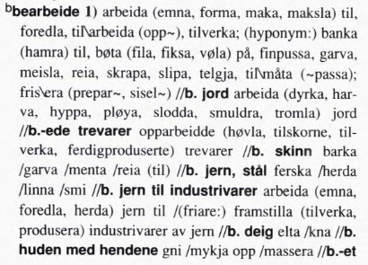 Nedanfor er eit utklipp frå Magne Rommetveits synonymordbok Med andre ord. Merk at bearbeide er litt av ei sekkenemning, og at det innanfor kvart fag gjerne finst fleire meir spesifikke ord (hyponym) for bearbeiding av eit emne eller for delar av prosessen. Bruk det mest presise som er dekkjande i kvar samanheng. (Å arbeide jorda er forresten ei gammal sekkenemning.)