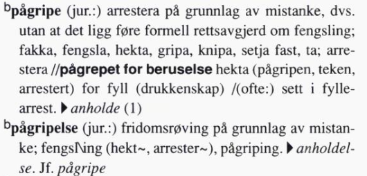 Ordet har no kome inn i Nynorskordboka med definisjonen ‘arrestere (på grunnlag av mistanke); gripe; hekte’. (Merk at ein ikkje kan arrestera nokon utan mistanke eller dom.) I Jon Gisles Jusleksikon står det at anholdelse, pågripelse og arrestasjon er synonym.