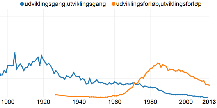Det å bruke forløp på bekostning av enklere ord som gang, er også en lang trend, jamfør en konstruksjon som verdensforløbet i dansk-norsk (for verdens gang). Nedenfor ser vi utviklingsgangen til en annen sammensetning, fra N-gramtjenesten til Nasjonalbiblioteket: