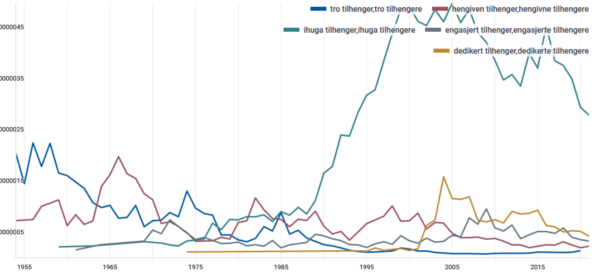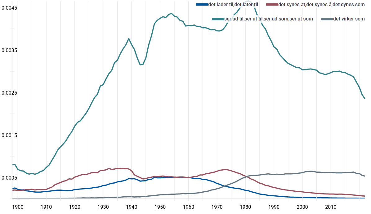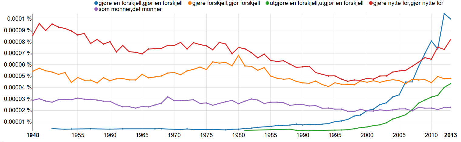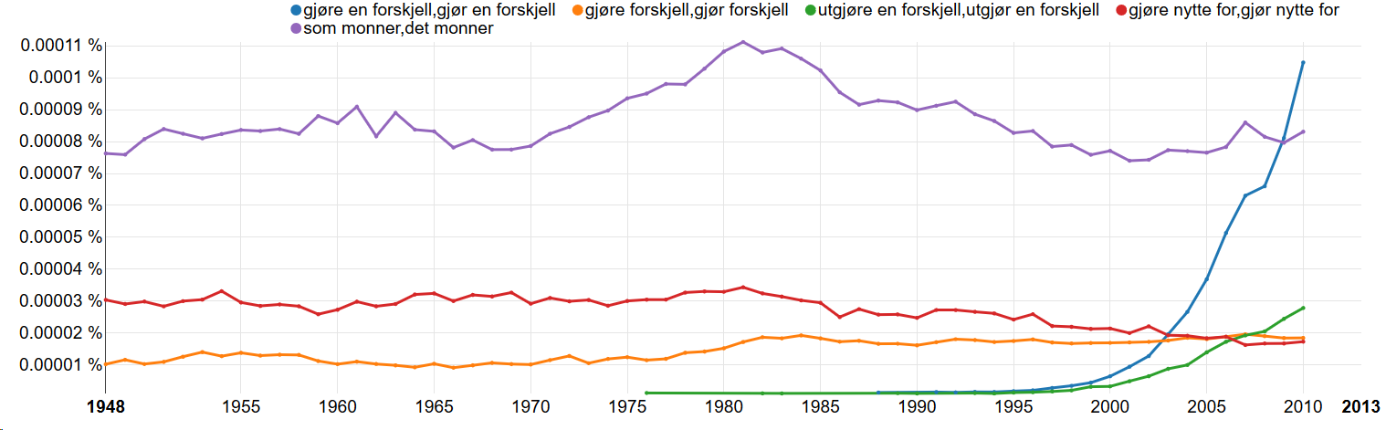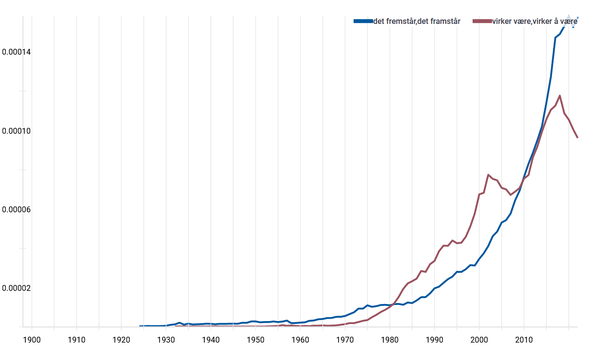 Nedenfor er et grovt bilde av utviklingen i aviskilder (nb.no, n-gram):