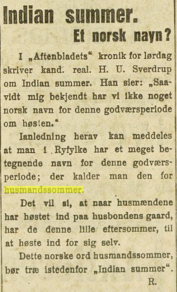I Stavanger Aftenblad 5.10.1916 står det eit forvitneleg innlegg om ein norsk ekvivalent til indian summer: