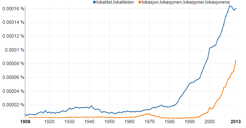 Her er resultatet av et søk i avisbaser (Nasjonalbiblioteket) som avslører at ordet lokasjon etter et blaff i 1960-åra (det ble registrert i dansk i 1961) for alvor fikk vind i seglene litt før år 2000. Mangedoblingen vitner om en farsott og kanskje en varig trend i navnsettingen.