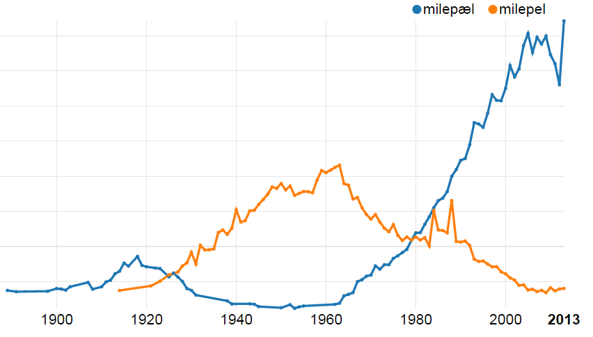 Utviklingen av milepæl og milepel i norsk litteratur (NB N-gram, nb.no):