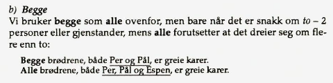 Ei heilt anna sak er at begge berre kan visa til to personar. Alle med norsk som morsmål meistrar dette utan vidare, og ingen vil finna på å skriva eller seia begge tre (altså 3) på ramme alvor. Her frå boka Et terskelnivå for norsk (1993):